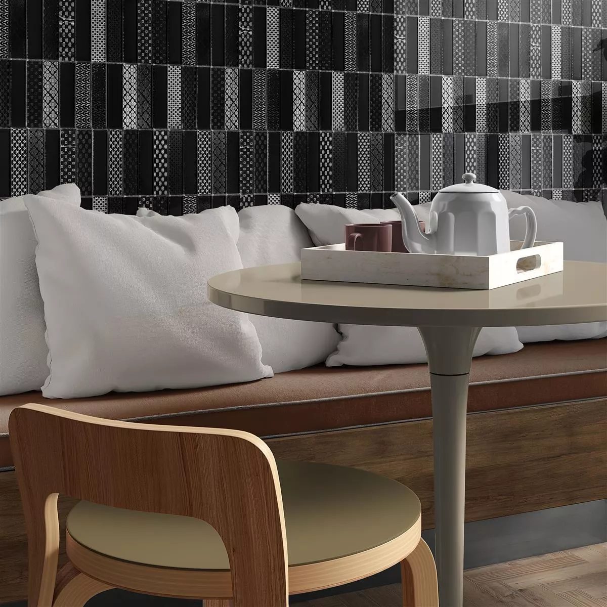Glasnaturstenmosaikplattorna Celestiana Ornament Brick Mix Black Mix är inte bara golv; de är en konstnärlig design av dina väggar. Ge ditt hem ett sofistikerat mörker med dessa plattor och skapa ett utrymme som kombinerar lyx och elegans.