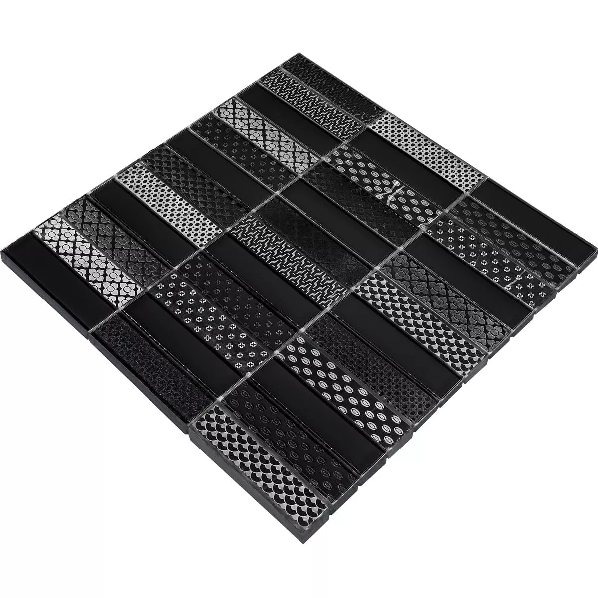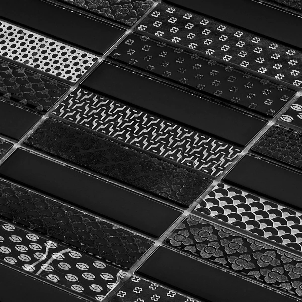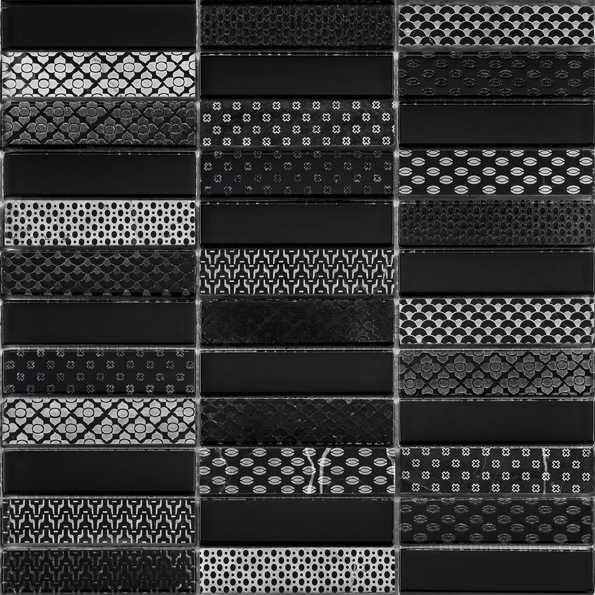 Glas natursten mosaikplattor Celestiana Ornament Brick Mix Black Mix - elegans i mörk sofistikering.