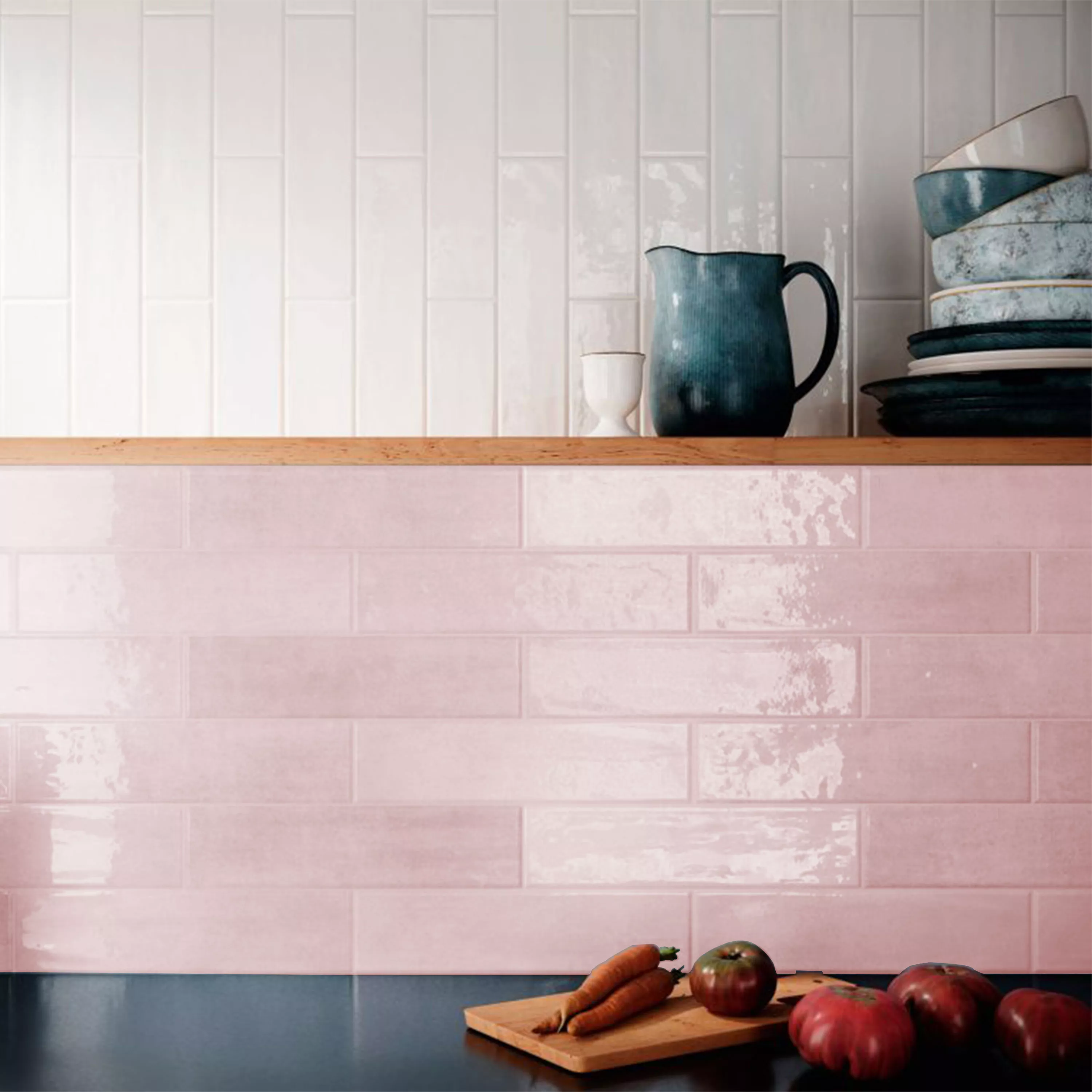 Tropea väggplattor i glänsande rosa och vågig struktur ger dina väggar en charmig vintage touch. Dessa glaserade rektangulära plattor som mäter 7,5x30 cm och 8,4 mm tjocka ger ditt hem en unik estetik. Den vågiga, glänsande ytan ger dina rum en subtil dynamik och en touch av elegans.