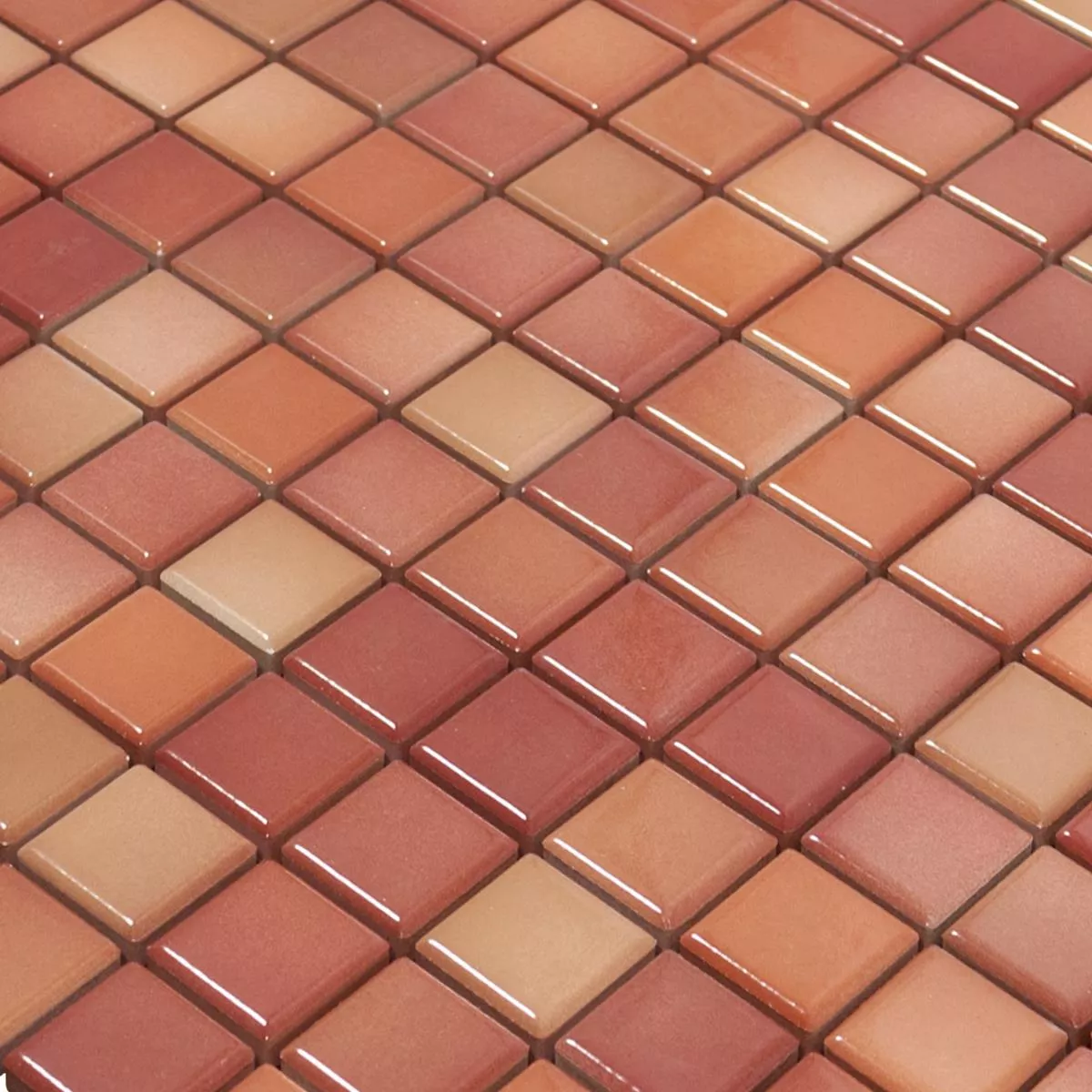 Gallerias keramiska mosaikplatta i en livlig röd blandning sätter imponerande accenter med sin iögonfallande metalllook och matta yta. Kakelplattan finns i en praktisk matta som mäter 29,7 x 29,7 cm, som redan är limmad på ett nät färdigt för montering. Med en stenstorlek på 23 x 23 mm och en tjocklek på 6,5 mm kan kaklet läggas enkelt och exakt på både väggar och golv.