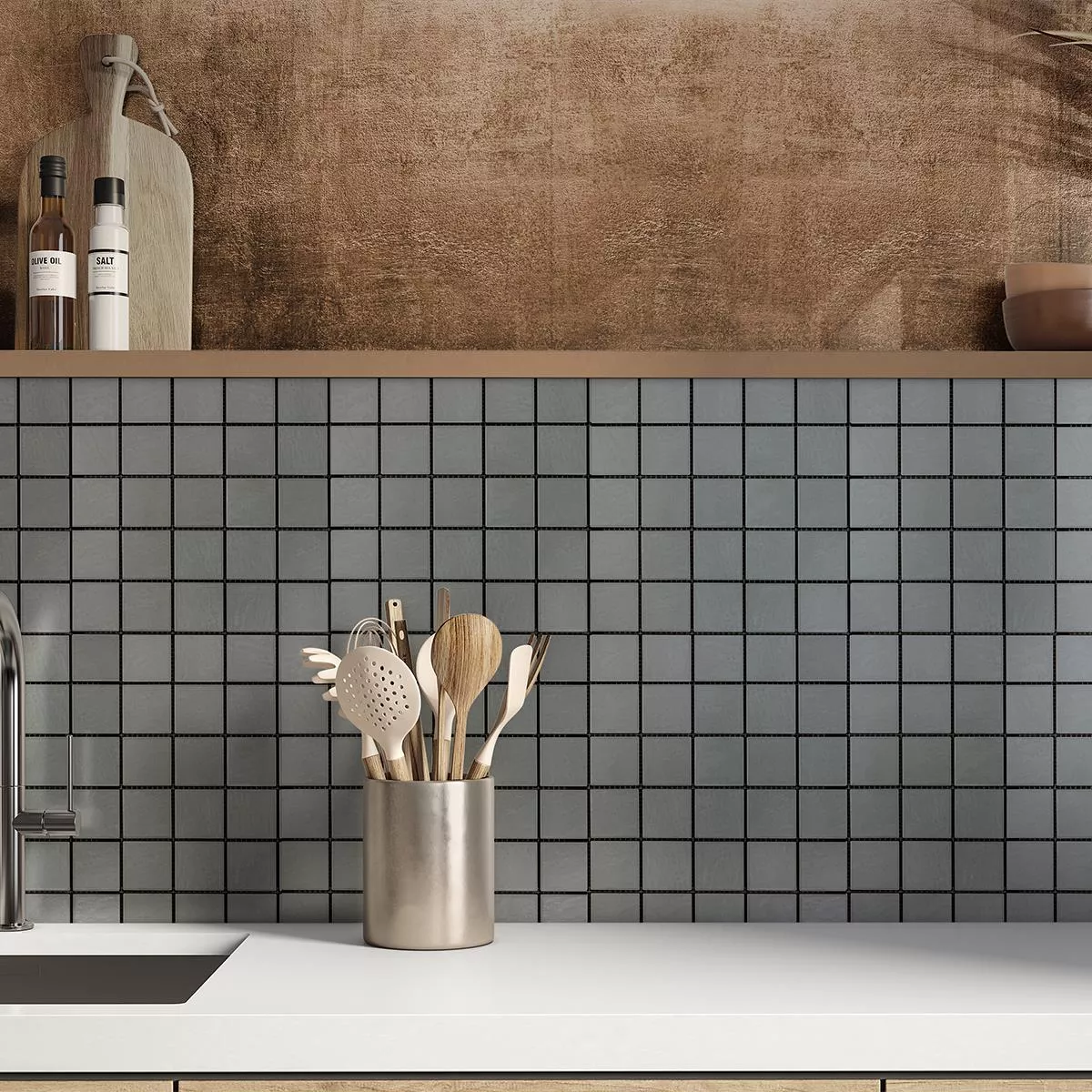 Med en fogbredd på 2 mm möjliggör Palazzia -plattan ett jämnt och elegant läggningsmönster som stilfullt framhäver det gråstensutseendet. Genom att kombinera estetisk design med praktiska fördelar är denna mosaikplatta idealisk för sofistikerade och eleganta vägg- och golvbeläggningar.