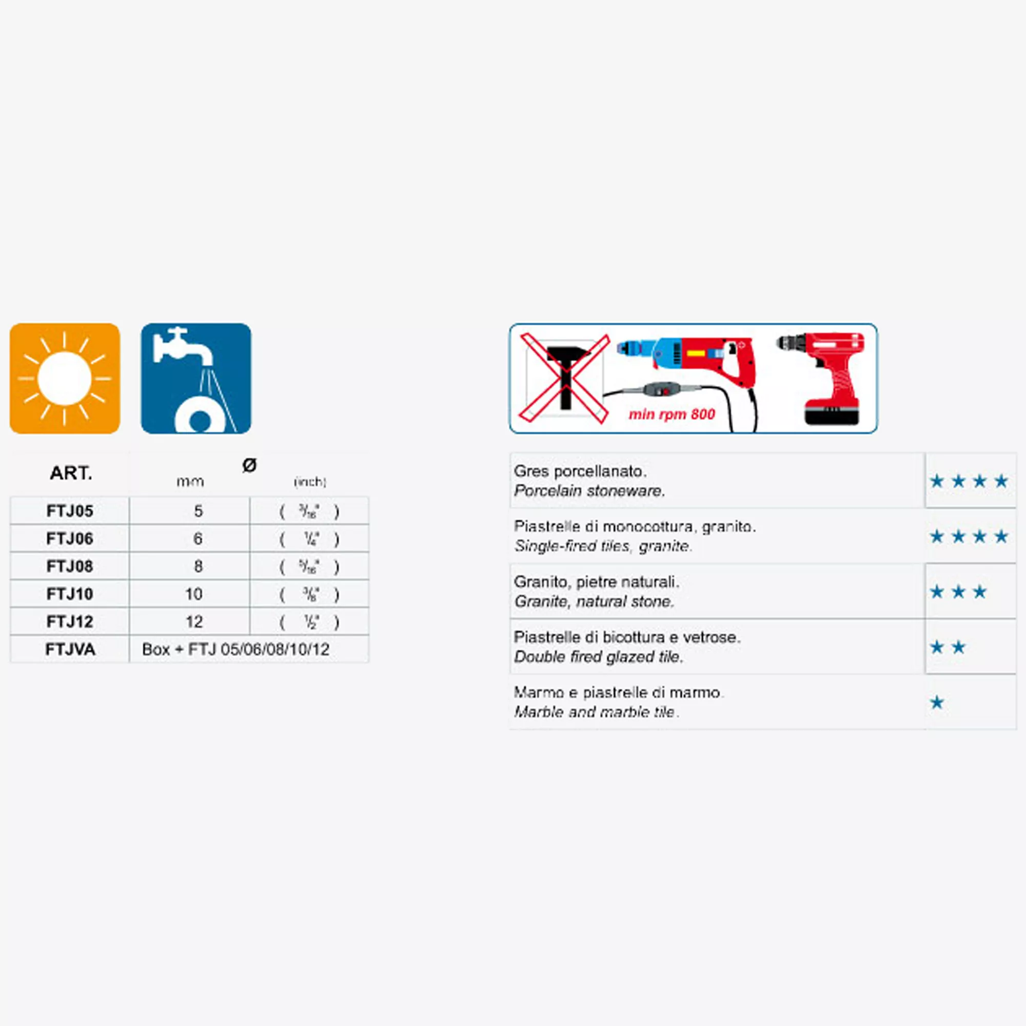 Borrkronan med diamant är lämplig för en borr med 800 varv per minut eller mer. Kronan är inte användbar vid lägre hastigheter. Det säkerställer ett rent snitt och försöker förhindra sprickor i plattorna. Varje storlek är tillgänglig individuellt. För att göra den lätt att skilja från andra tillverkare målades den grön. De individuella storlekarna är 5 mm, 6 mm, 8 mm, 10 mm och 12 mm i diameter. För att uppnå bästa resultat rekommenderas att torka ytorna rena i förväg. Plattorna kan bearbetas både individuellt och monteras på väggen. Att tillsätta lite vatten till borrkronan förhindrar överhettning. Diamanten är långvarig och kan användas väldigt bra många gånger.