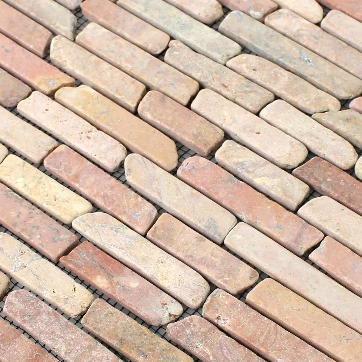 De högkvalitativa mosaikplattorna från Bali Bricks-serien är gjorda av äkta marmor. Därför frammanar dessa naturstensplattor en touch av elegans och lyx i varje rum i huset. Den fina marmormosaiken tumlas så att ytan på dessa mosaikplattor ser väldigt naturlig ut. Färgmässigt erbjuder dessa naturstensplattor en visuellt mycket tilltalande syn, eftersom den ädla marmormosaiken är sammansatt av olika nyanser. Bali Bricks-serien inspirerar med mjuka röda toner och ljust vitt. Denna modell är en blandning av mosaikplattorna Rosso Cream och Bianco, så att Bali Bricks-plattorna också kan kombineras perfekt med de andra naturstensplattorna. Särskilt större rum kan smart möbleras med de olikfärgade plattorna.