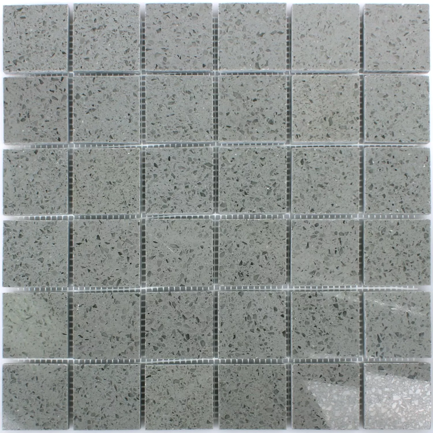 Trendiga mosaikplattor säkerställer en modern, hemtrevlig atmosfär i alla rum. Därför är de vackra polerade Latina naturstensplattorna ett bra val för alla privata och offentliga utrymmen. Den distinkta stenmosaiken är gjord av kvarts och syntetiskt harts, vilket gör den lätt att underhålla också. Dessa mosaikplattor i de subtila tonerna av grått, svart och vitt erbjuder mycket variation för ögat tack vare de sofistikerade prickarna. Eftersom Latina Polished naturstensplattor finns i tre olika färger kan de läggas i husets alla rum. Badrummet och köket är ljust, uterummet och festlokalen är mörka och övriga rum är designade i den enkelt eleganta gråtonen.
