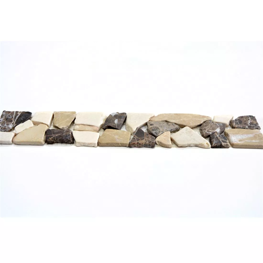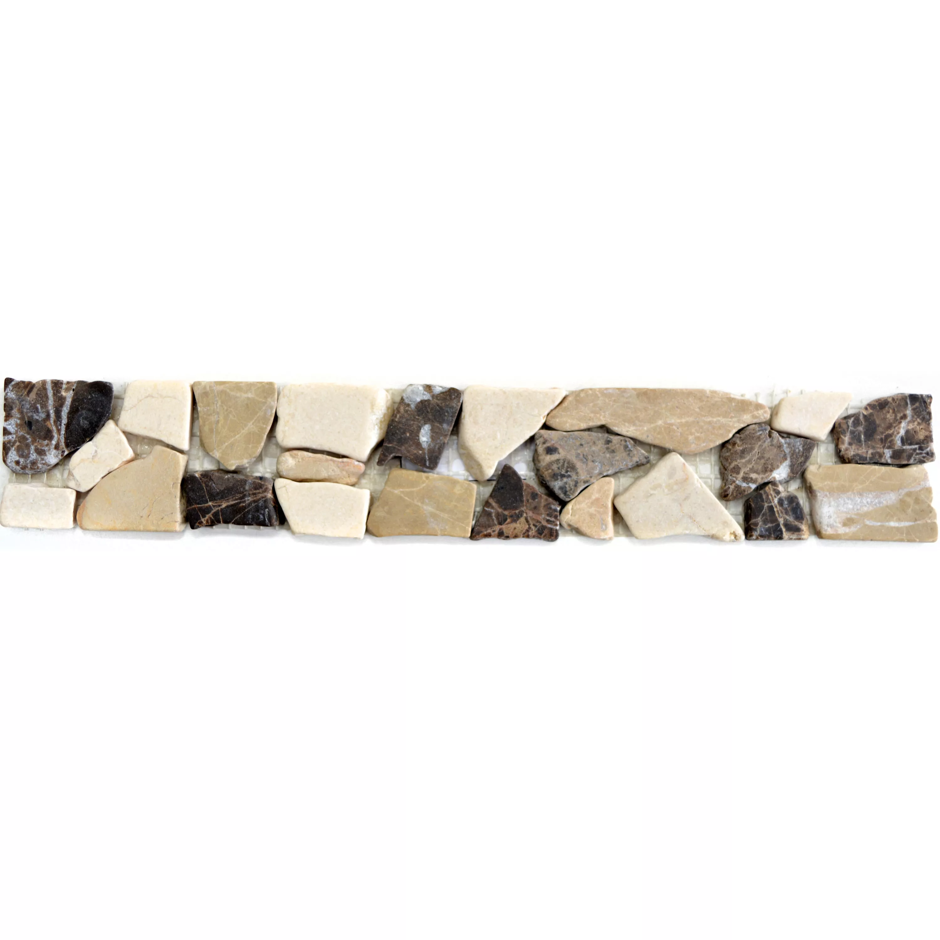 Denna badrumsbård av natursten från Riesco-serien är en speciell höjdpunkt för varje badrum och frammanar en mycket speciell, mycket trevlig atmosfär tack vare naturstensdetaljerna och mönstren. Användningen av natursten gör att färgen på de enskilda stenarna varierar något, vilket till och med ger badrummet en väldigt individuell touch. Det bör också nämnas att ytan är matt och skuren. Tjockleken på denna kant är 7 millimeter.