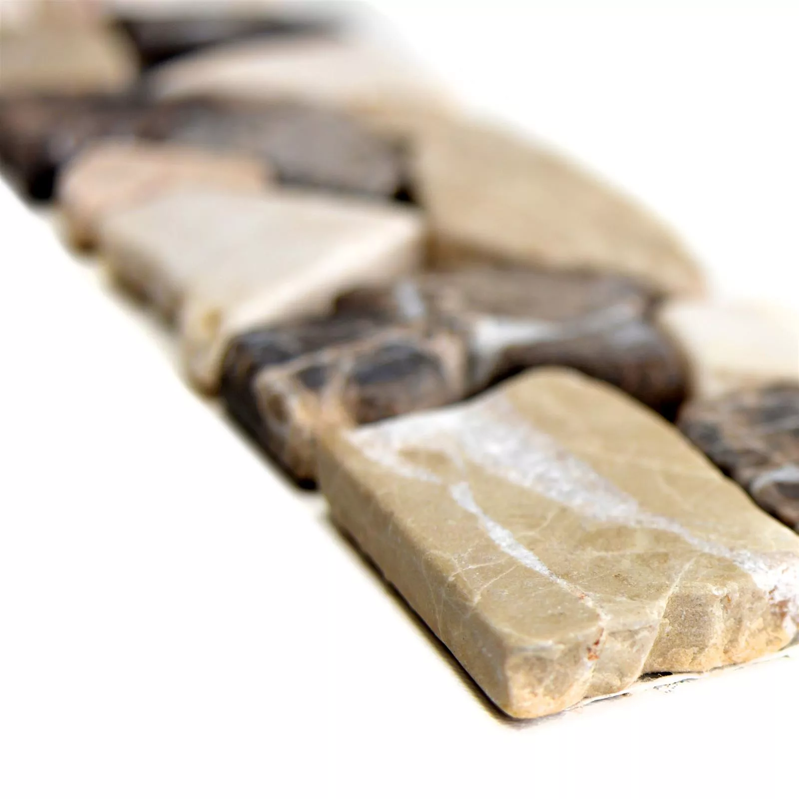 Förvandla badrummet till ett feel-good-paradis – du kommer ett steg närmare detta mål med en bård i natursten från Riesco-serien. Alla vill ju må bra i sitt eget badrum. Med denna bård av Riesco stenplattor är mattans mått 5 centimeter gånger 30 centimeter. Den mosaikliknande bården är gjord av natursten och för därmed in en bit av naturen i badrummet. Badrumsplattorna resulterar i ett koncept som påminner om naturens skönhet och dess symboliska frihet. Tack vare denna kakelkant i badrummet kan du tänka dig att stå bredvid ett vattenfall istället för bredvid ditt eget badkar. När det gäller bården avsedd för badrummet varierar stenstorleken mellan 20 och 40 millimeter. På grund av dessa olika storlekar ser den övergripande bilden av Riesco-kakelkanten av natursten i badrummet ännu mer naturlig ut och erbjuder även en fantastisk mosaikeffekt.