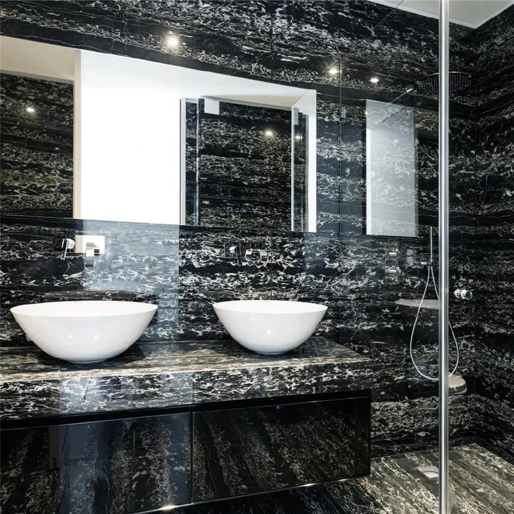 Med naturstensplattan Discovery Nero Galactica 60x60, som också är polerad, kan varje badrum fräschas upp visuellt. Även om golvvärme används eller det blir lite kallare i badrummet så tål dessa golvplattor med naturstenslook de där temperatursvängningarna. Naturstensplattor ser ut när svart möter ljus Den polerade finishen av fina stengodsplattor eller golvplattor kommer till sin rätt först när man har tänkt på rätt belysning.