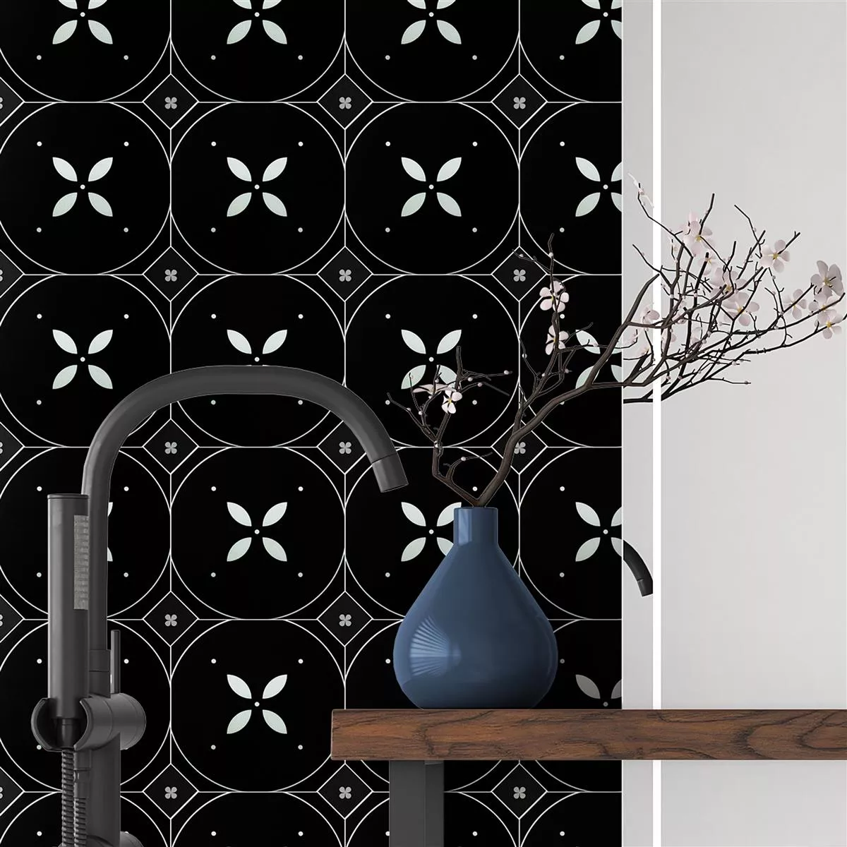 Genexia Black White Decor 1 inläggningsplattor av porslin i stengods ger tidlös elegans till alla interiörer. Det fyrkantiga formatet med en matt finish passar för både väggar och golv, och dess dekorativa svartvita design kommer att sätta en speciell touch till dina rum.