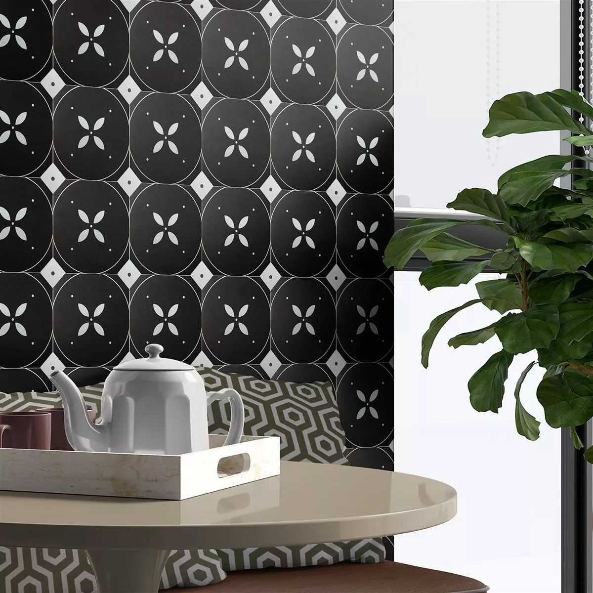 Stengods Plattor Genexia Svart Vit Decor 3 Rosone 4,6x4,6cm