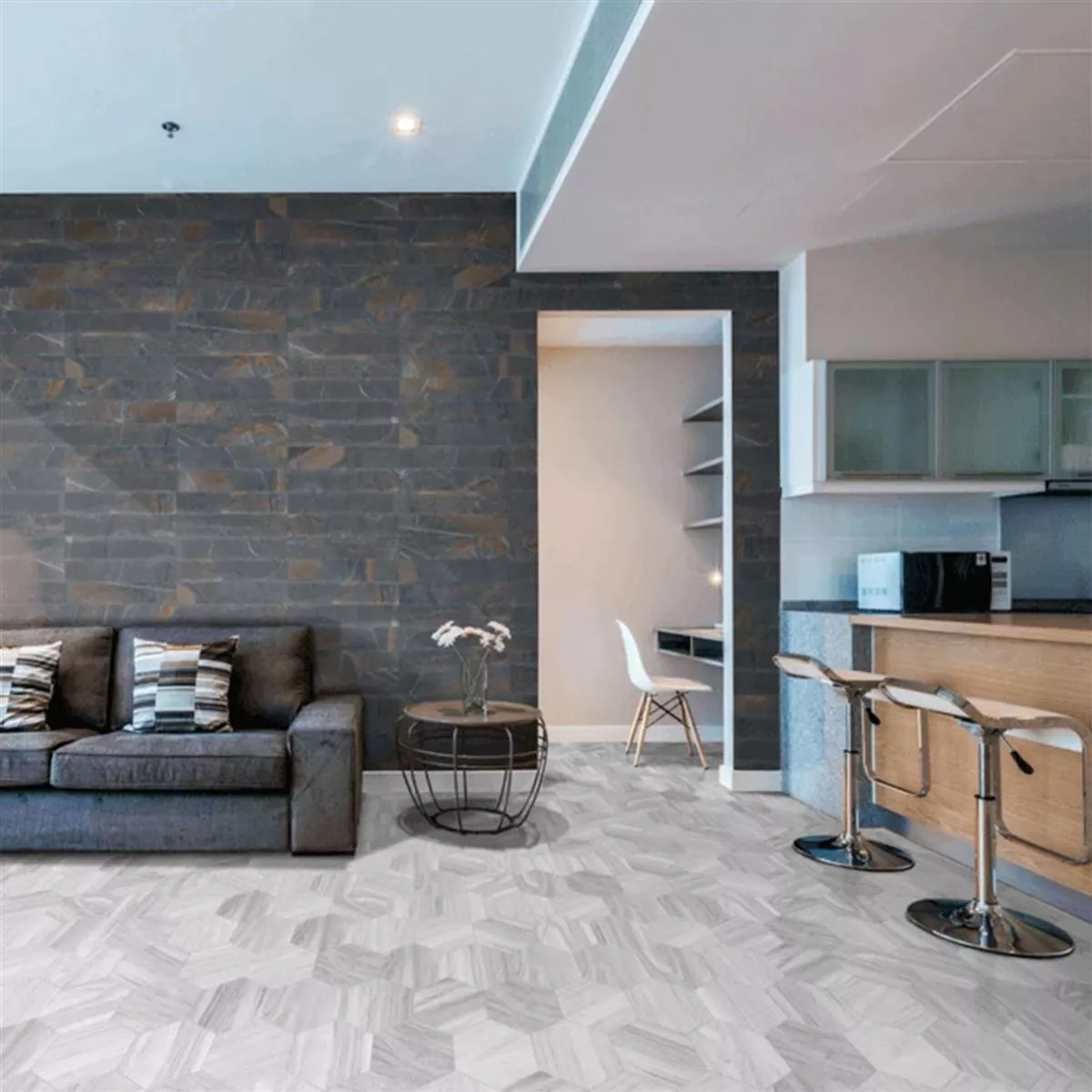 Ge dina rum ett nytt utseende och skapa en feel-good atmosfär med Hexwood Hexagon Grey porslinsstengodsplattor.