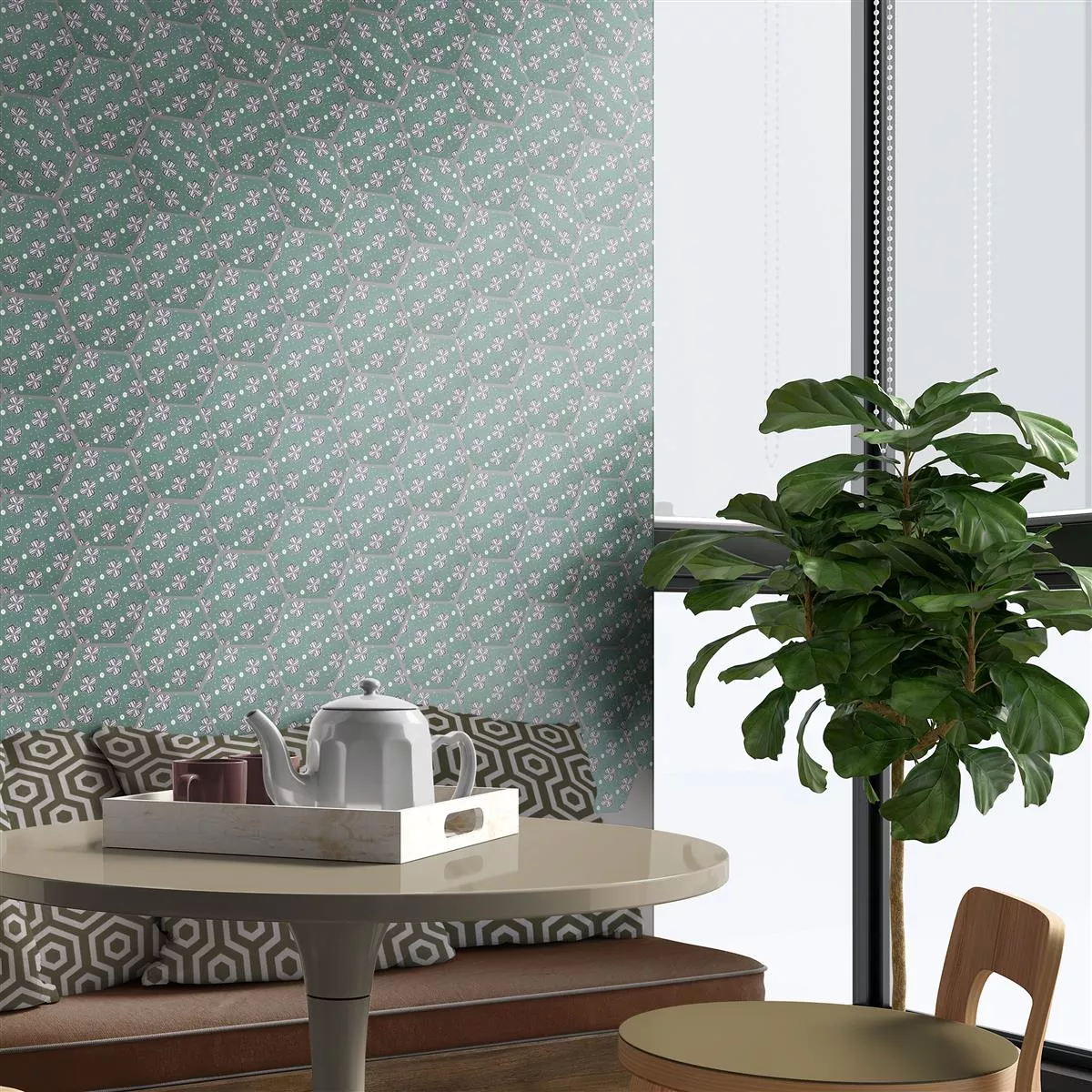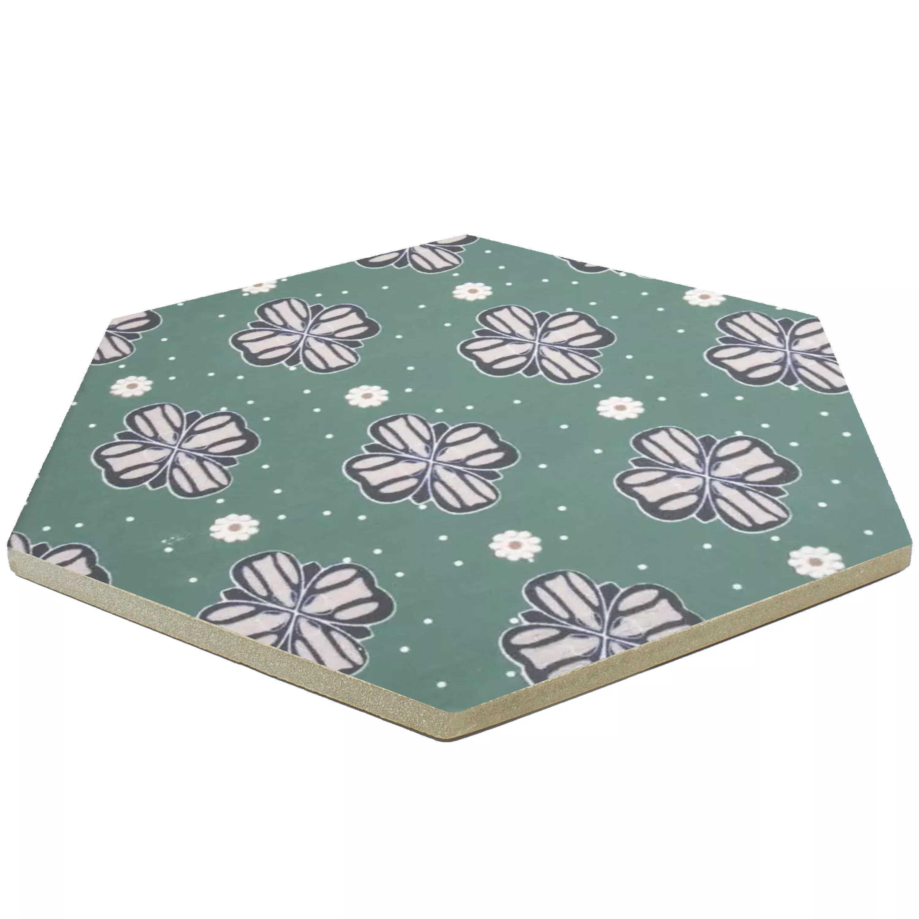 "Modena Hexagon Decor 7" porslinsplattor i stengods kombinerar imponerande design med hög funktionalitet. Med en tjocklek på 10 mm är de perfekta för våtutrymmen, duschar, badrum, kök, vardagsrum och inomhusutrymmen. Den matta ytan, i en attraktiv grön med blommiga ornament, ger plattorna ett tidlöst elegant utseende.