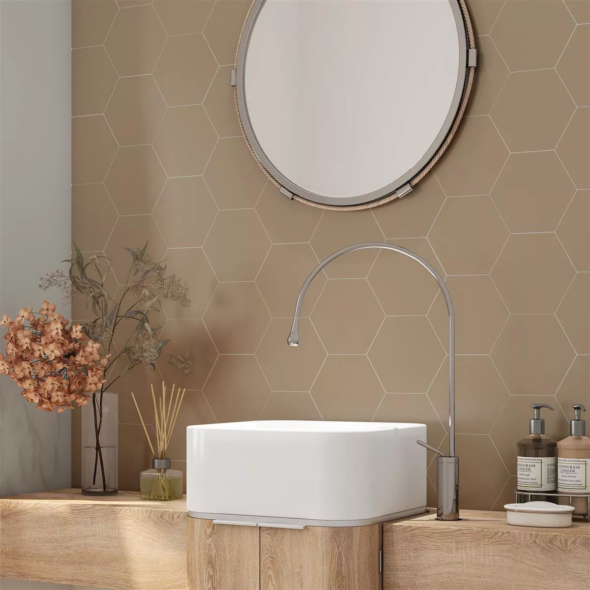 "Modena Hexagon Uni Sand" porslinstengodsplattor kombinerar estetik och funktionalitet i ett. Med en slående hexagondesign skapar de en unik atmosfär i ditt våtutrymme, dusch, badrum, kök, vardagsrum och inomhusutrymme. Med en tjocklek på 10 mm erbjuder de en solid bas, medan R10-halkskyddet garanterar säkerheten.
