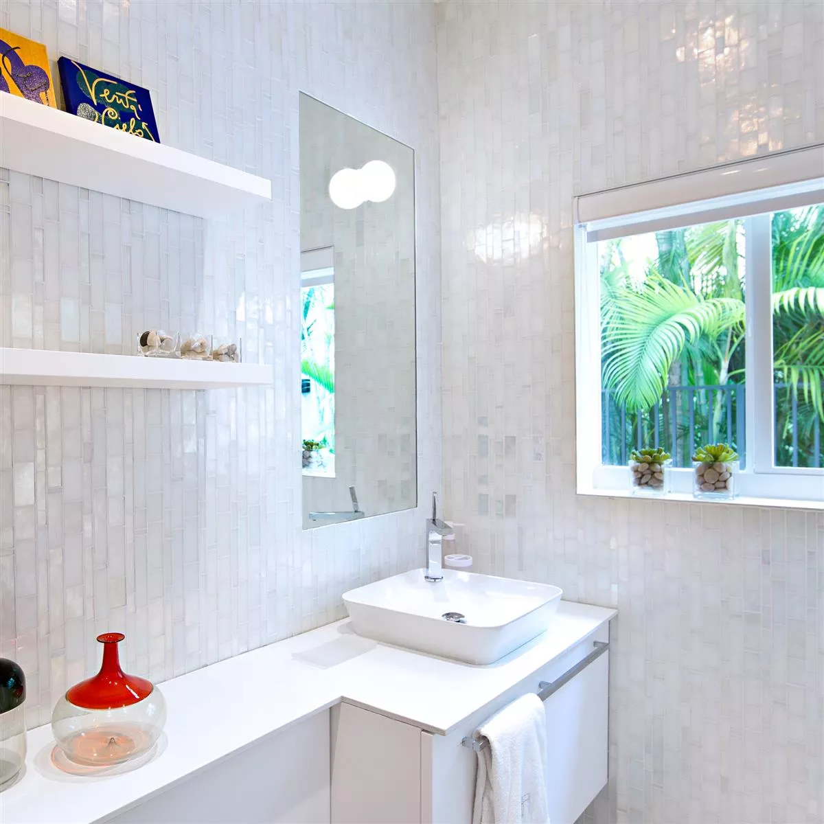 Om du värdesätter individuell stil, högkvalitativt material och en trendig look när du inreder ett vardagsrum, bör du lära känna glasmosaikplattorna Metropolis i Pearl. Denna glasmosaikplatta är gjord av den berömda och berömda italienska tillverkaren av glaskeramik, Trend-Vi-företaget. Golv som försetts med glasmosaik har ett särskilt elegant utseende men är lika lättskötta och tåliga som andra klinkergolv Mosaikplattorna finns som pinnar med tjocklek 4 mm, mattstorleken är 30,8x28. 8 cm.